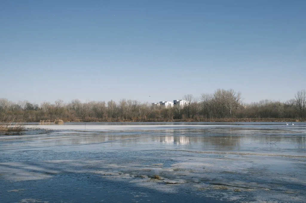 Wtedy doszedłem do małej zatoczki, która wciąż była pokryta taflą lodu. Widok natychmiast przyciągnął moją uwagę — kontrast między białym lodem, szarymi odcieniami otoczenia i niebieskim niebem wyglądał naprawdę malowniczo. Zacząłem szukać kadrów i po kilku minutach ujrzałem dwa łabędzie, pływające ospale nieopodal. Niestety były za daleko, żeby je sfotografować, zwłaszcza że miałem ze sobą jedynie Fujifilm X100VI z obiektywem 35 mm. Jednak ku mojemu zaskoczeniu ptaki zaczęły zbliżać się w moją stronę, weszły nawet na taflę lodu i powoli szły dalej. Nadal były nieco zbyt daleko, ale za pomocą cyfrowego zoomu udało mi się złapać fajny kadr z parą łabędzi w tle.